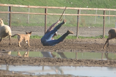 I describe herding as the art of moving livestock from one place to another. This picture is an illustration of what can happen to one who is struggling to develop that artistic talent after a rainy day. Here is the link to the home page. |